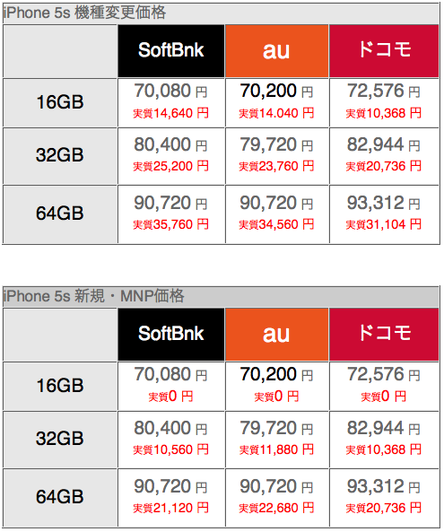 iPhone 5sの価格参考に(ソフトバンク ドコモ au)