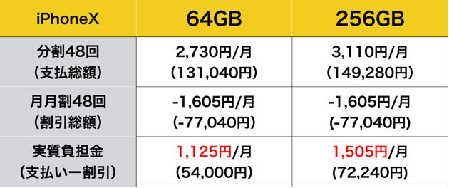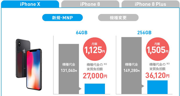 こちらは新しくスタートする「半額サポート for iPhone」を適用し、「iPhone X」を新規契約・MNP(のりかえ)する際の48回払いの値段です。