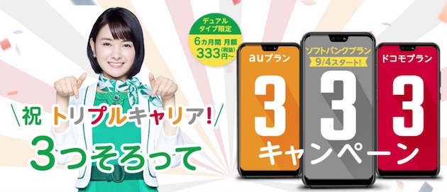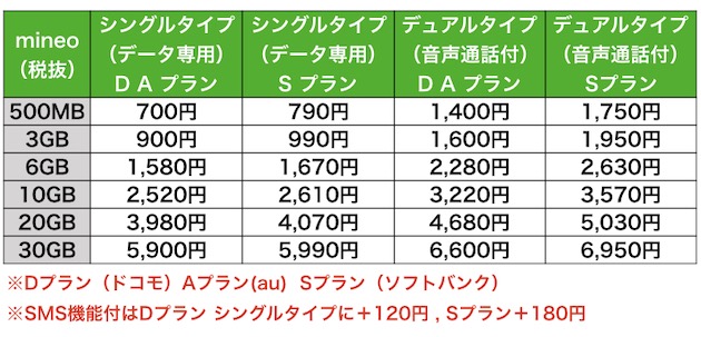 au回線で始めたmineoのサービス。そのあとドコモ回線も扱うようになり、9月にはついにソフトバンク回線も開始してトリプルキャリア対応になりました。au,ドコモの料金体系は同じですが、ソフトバンクはちょっとだけ高くなっています。