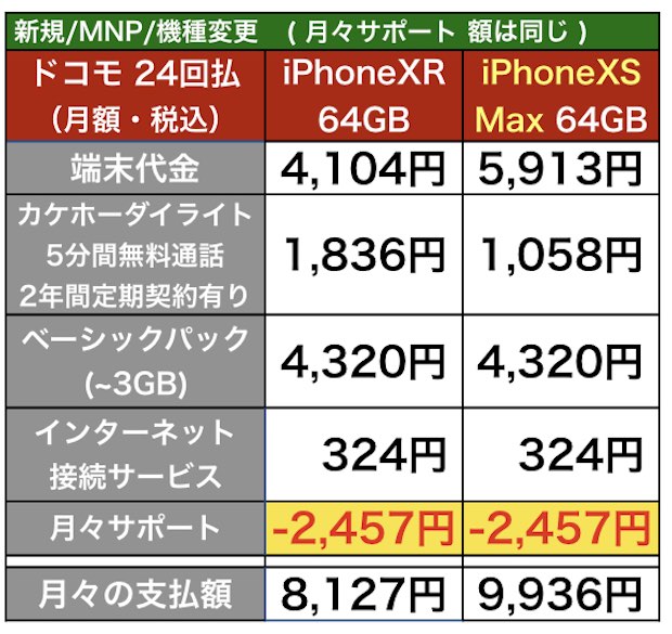 ドコモ iPhoneXR / iPhoneXS / iPhoneXS Max の月々の支払い額は?