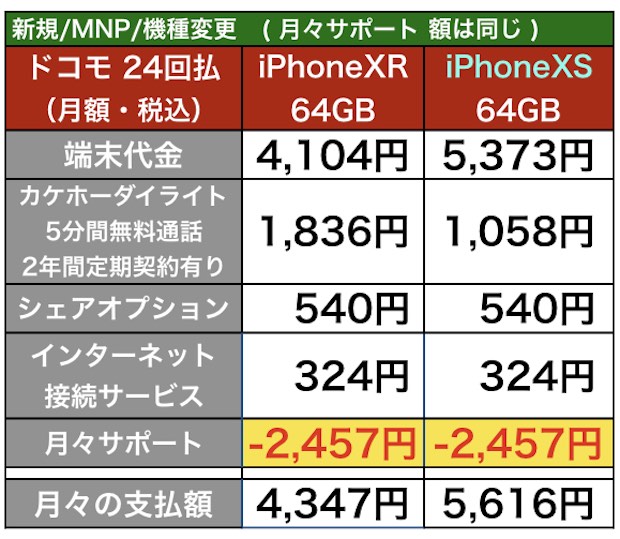 以上、iPhoneXR / iPhoneXS / XS Maxのドコモでの価格と月々の支払額についての比較でした。
