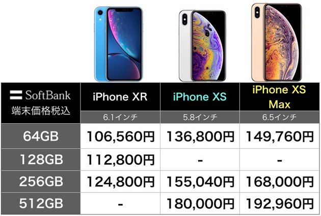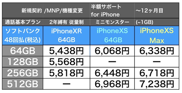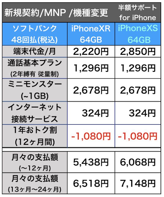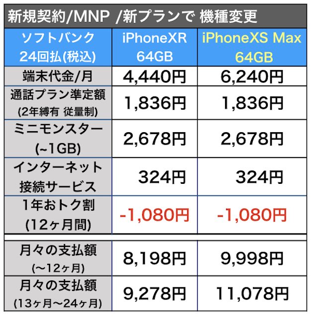 ソフトバンク iPhoneXRとXS / XS Maxの月々の支払い額比較(新規契約/MNP/機種変更 ※2年縛有)